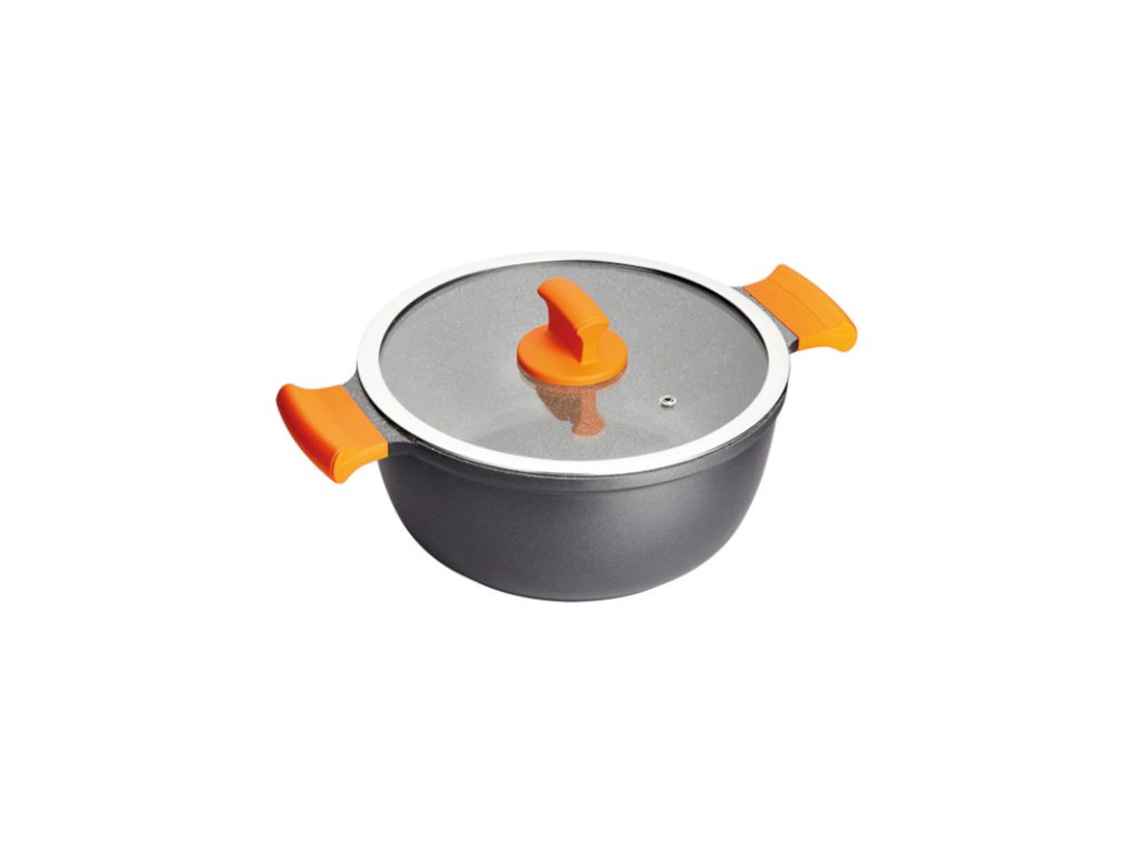 Skleněná poklice umožňuje sledovat jídlo během vaření, aniž by se sundávalo víko, což šetří energii. Parní uzávěr zabraňuje zapařování poklice a vypouští přebytečnou páru, čímž zabraňuje jeho nadzvednutí. Povrchová úprava s kamenným efektem. Tento vkusný design doplňují veselé oranžové měkké rukojeti a úchyt.