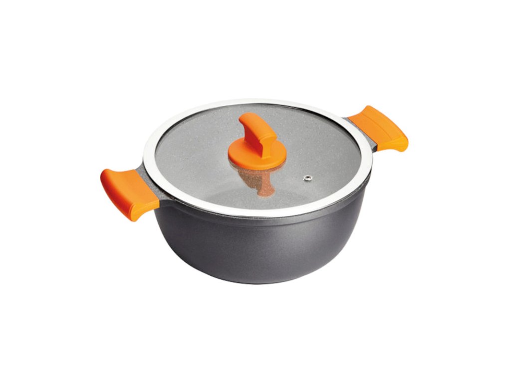 Skleněná poklice umožňuje sledovat jídlo během vaření, aniž by se sundávalo víko, což šetří energii. Parní uzávěr zabraňuje zapařování poklice a vypouští přebytečnou páru, čímž zabraňuje jeho nadzvednutí. Povrchová úprava s kamenným efektem. Tento vkusný design doplňují veselé oranžové měkké rukojeti a úchyt.
