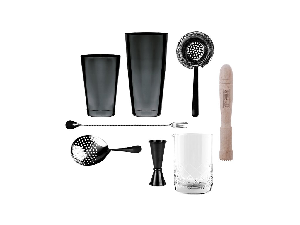 Barmanská sestava v černé barvě se hodí do každého baru pro přípravu míchaných drinků a jiných nápojů.
