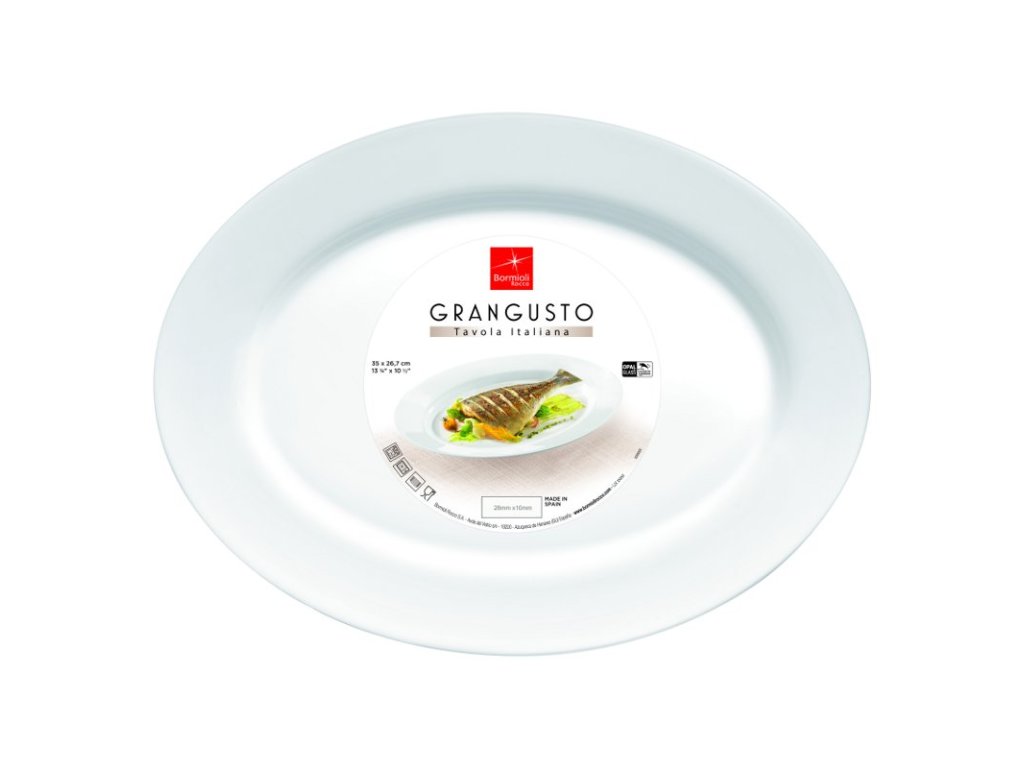 Talíř na ryby FISH s širokým praporem vám umožní elegantní servírování grilovaných či pečených ryb. Jednoduchý design talíře se bude vyjímat jak v moderních, tak i tradičních restauracích a opálové sklo vám zpříjemní pobyt v kuchyni. Výrobky kolekce Grangusto můžete mýt v myčce nádobí, ohřívat v mikrovlnné troubě i skladovat v lednici.Talíř 35 × 26,7 cm – FISH