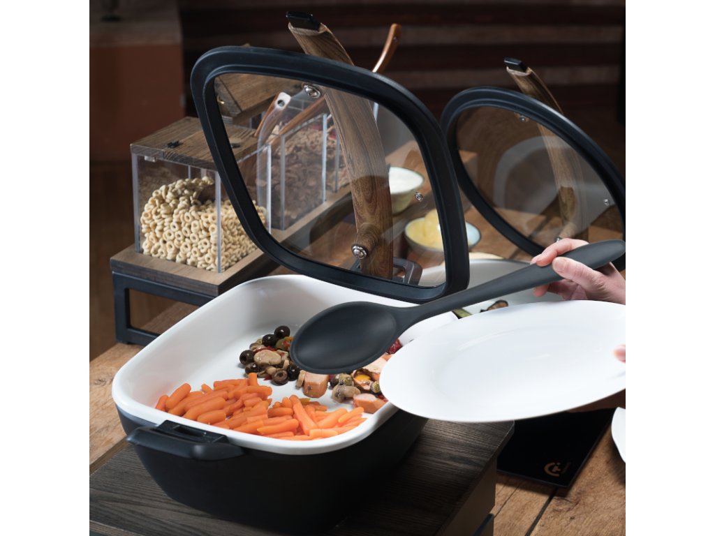 Hranatý chafing s černým víkem a rukojetí s dřevěným motivem je řešení pro prémiové bufety, catering a restaurace. Díky modernímu vzhledu a odolným materiálům zajišťuje nejen krásný vzhled, ale také dlouhou životnost a pohodlné používání. Tělo chafingu je vyrobeno z tlakově litého hliníku, což zaručuje rovnoměrné rozložení tepla, a je doplněno nerezovou vložkou 18/10 pro snadnou údržbu a hygienický provoz. Víko z tvrzeného skla umožňuje přehled o podávaných pokrmech, aniž by u nich docházelo ke ztrátě tepla. Využití:- hotelové bufety a cateringové služby –servírování teplých pokrmů