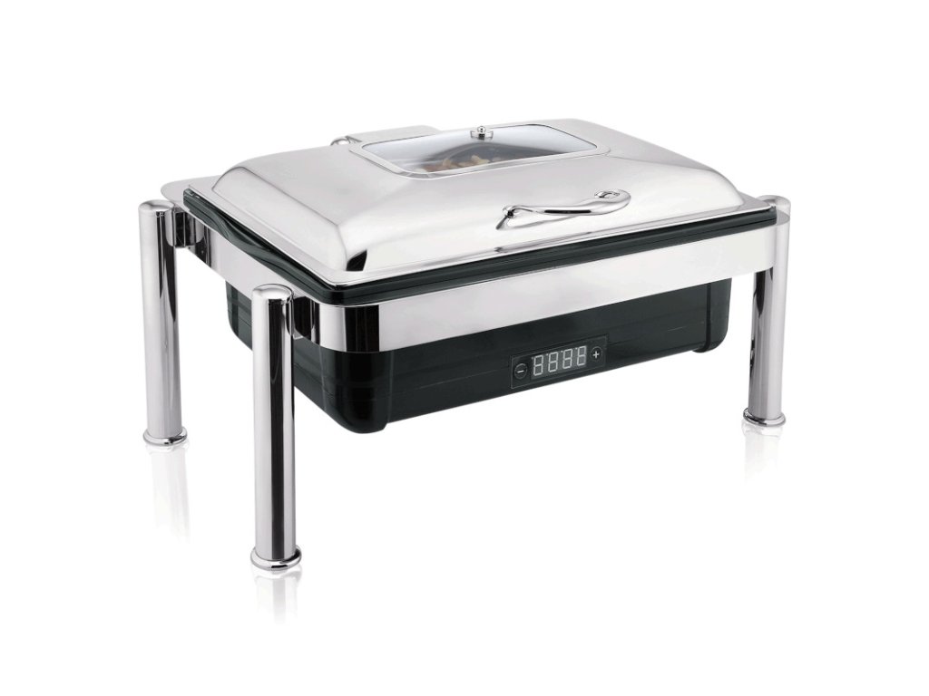 Elektrický chafing s regulačním termostatem pro gastronádobu GN 1/1 (65 mm) se skvěle hodí pro podávání různých snídaňových rautů či jinde, kde je třeba jídlo teplé. Digitální displej poskytuje předvolbu teploty mezi 20 °C a 85 °C. Výklopné víko z nerezové oceli s okýnkem umožňuje vidět stav a množství podávaných pokrmůChafing elektrický s diplejem