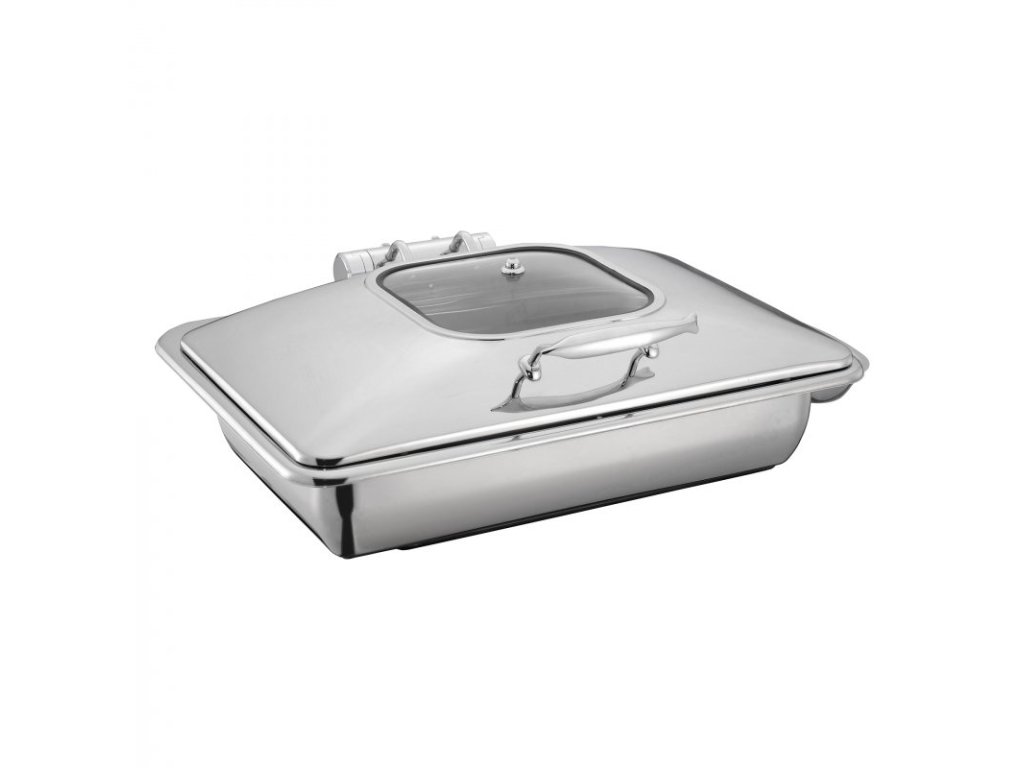 Chafing slouží pro ohřev a padávání teplých pokrmů. Tento model lze umístit přímo na indukci zabudovanou v pracovní desce nebo na základnu pomocí adaptéru a následně ohřívat topným tělesem. Chafing je vybavený krytem, který zabraňuje kapání a znečišťování desky stolu. Disponuje odklápěcím víkem s brzdami.- Podstavec pro doplnění: V-1130-72K