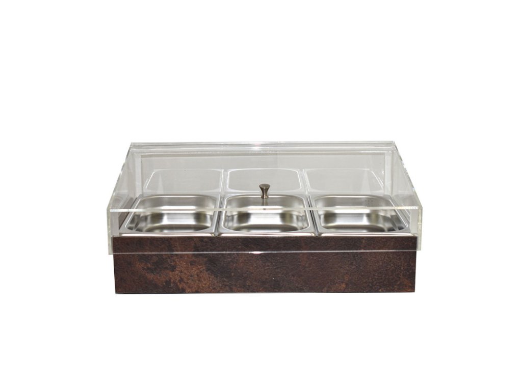 Chladicí box pro gastronádoby GN 1/1 s krytem v dekoru rzi je vhodnou volbou pro profesionální snídaňové bufety, cateringové akce a samoobslužné provozy, ve kterých je potřeba udržet pokrmy čerstvé a v optimální teplotě. Díky dvěma chladicím vložkám a boxům proti vlhkosti je zajištěno chlazení bez kondenzace. Transparentní kryt chrání obsah před kontaminací a zároveň umožňuje snadnou vizuální kontrolu. Box disponuje rozměry 530 x 100 x 325 cm a je kompatibilní s gastronádobami GN 1/3 (3 ks), GN 1/2 (2 ks) nebo GN 1/1 (1 ks), což umožňuje variabilní využití dle potřeb provozu.Set obsahuje