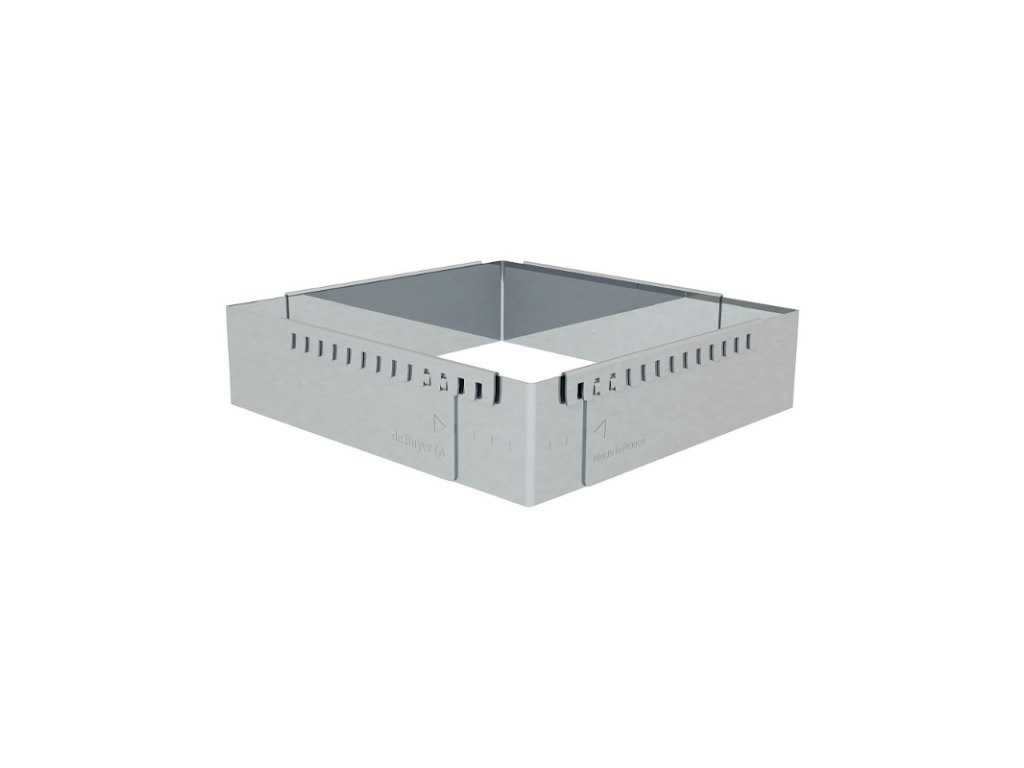 Rozšířitelná nerezová forma s ostrými rohy je ideální volbou pro přípravu mousse, dezertů na krémové bázi, piškotových dortů nebo Joconde piškotu. Forma se díky inovativní koncepci snadno používá: Za pomocí háčků si nastavíte potřebnou velikost na vnější horní hraně. Vhodná do mrazáku, vysokotlakého chladiče, lednice i do trouby. Po použití můžete dát do myčky.Forma nerezová rozšířitelná 30 × 30 cm