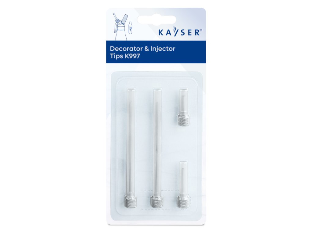 Sada dekoračních a jehlových trysek má mnoho využití, jako například pro plnění sladkých i slaných jídel, předkrmů, dezertů (suflé, větrníky, koblihy), vstřikování marinád do masa, drůbeže, dekoraci dezertů a zákusků a také na prezentaci talířů. Trysky se vyrábí z kvalitní nerezové oceli a jsou kompatibilní se šlehačkovými láhvemi Kayser. Po použití je důkladně umyjte ručně nebo v myčce nádobí a uložte s nasazenými ochrannými kryty.Dekorační a jehlové trysky