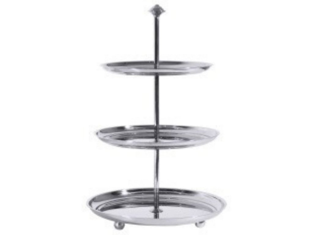 Vystavte své cukroví a zákusky na odiv na třípatrovém etažéru. Na jeho výrobu se používá nerezová ocel, která odolá korozi a vydrží dlouhou dobu i při intenzivním používání.Etažér nerezový 39,5 cm