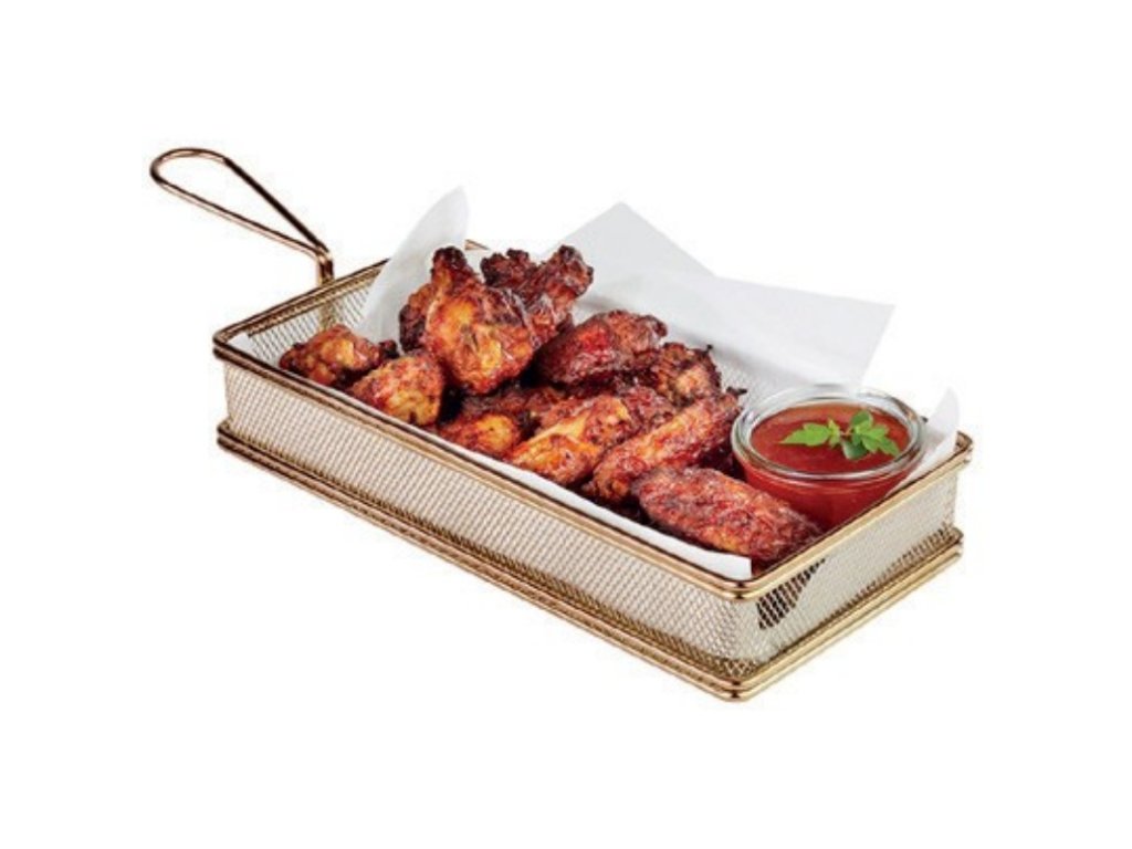Servírovací košík umožňuje smažit malé množství zeleniny, brambor, krevet nebo čehokoliv jiného. Také parádně poslouží k samotné prezentaci pokrmů na jídelním stole. K představování doporučujeme nejprve vložit olejový papír do košíku a až na něj umístit smažené jídlo. Tak dosáhnete jednoduchého a stylového efektu. Košík se vyrábí z kvalitní nerezové oceli a zajišťuje elegantní způsob prezentace vašich pokrmů.Košík servírovací 26 × 13,5 × 5 cm
