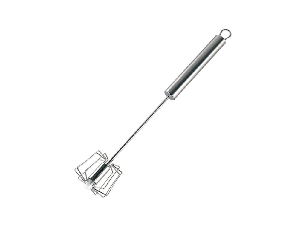 Tato otočná metlička je ideální pro snadné a rychlé míchání potravin. Stačí ji lehce zatlačit a automaticky se otočí. Nezbytný pomocník v každé kuchyni, neboť míchá, šlehá a emulguje omáčky, krémy, těsta a především bílky na sníh. Má nerezovou rukojeť i dráty a závěsné oko pro pohodlné skladování. Lze ji mýt v myčce nádobí.Mechanický šlehač 25 cm