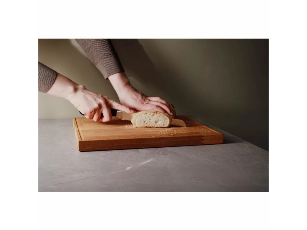 Krájení chleba, které nedrolí kůrku ani netlačí střídu – přesně k tomu byl tento kovaný nůž navržen. Zoubkované ostří se zakusuje do kůrky a nechává za sebou čistý řez, který ocení každá hotelová snídaně i řemeslná pekárna. Hrubé chleby, jemné briošky, sendviče nebo vrstvené dorty – všude tam, kde se láme chléb a záleží na prezentaci, plní svou roli spolehlivě. Čepel o délce 20 cm je vykována z nerezové oceli, což zajišťuje odolnost a rovnováhu při práci. Nůž dobře sedí v ruce díky plastové rukojeti.