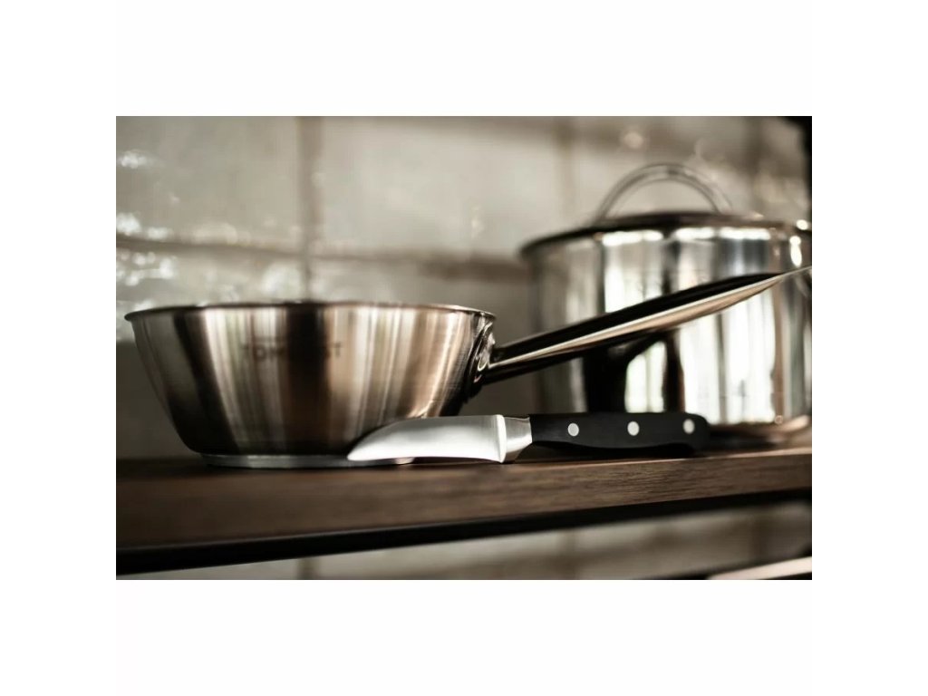 Kovaný nůž JustCut je navržen pro rychlou a přesnou práci při očišťování a zpracování a zeleniny do jakékoliv kuchyně. Díky krátkému, mírně zahnutému ostří snadno kopíruje tvar surovin, a tak se ideálně hodí na škrábání brambor, loupání jablek nebo rychlé porcování menších kousků. Čepel je vytvořená z nerezové oceli, která je kovaná – od čepele až po trn a rukojeť z černého tvrzeného plastu je připevněna třemi nýty. Integrovaná záštita chrání prsty a zajišťuje správné vyvážení při krájení. V rychlém provozu jej dokonce můžete mýt v myčce na nádobí.