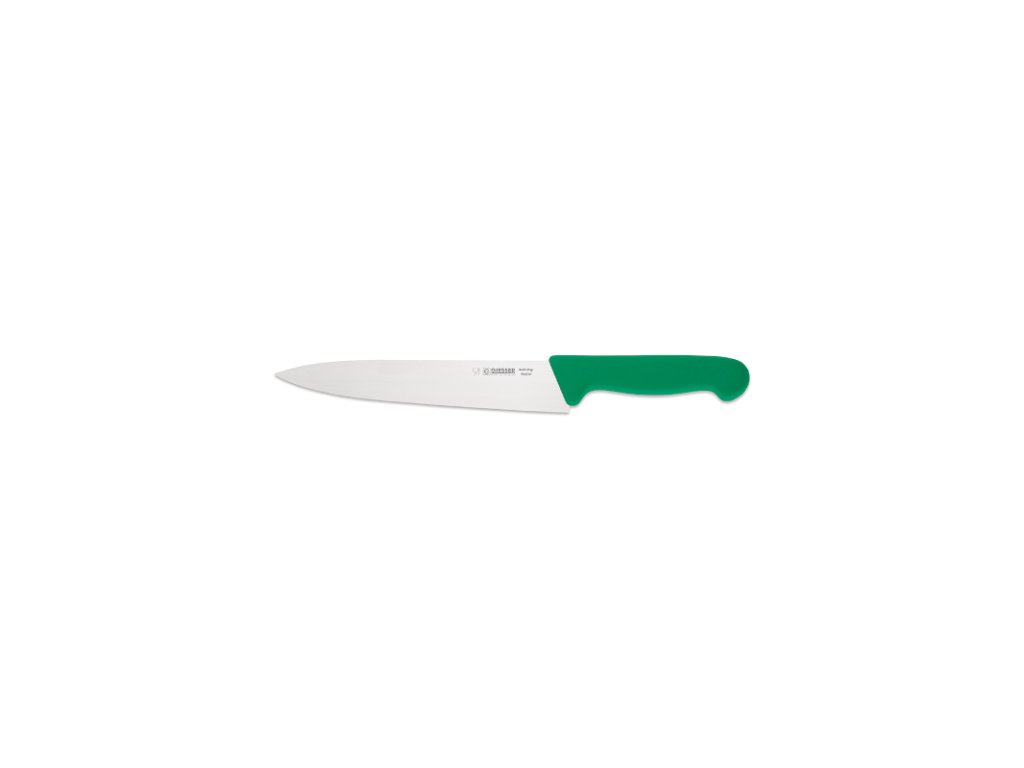 Tento kuchařský nůž od německého výrobce Giesser nesmí chybět v žádné kuchyni. Jeho čepel se vyrábí z vysoce kvalitní chrom-molybdenové oceli, která je kalená ve vakuu na tvrdost 56–57 podle Rockwella. Matně leštěný povrch zajišťuje nejvyšší možnou odolnost proti korozi a trvanlivost břitu. Úzký tvar se špičatou špičkou je univerzálně použitelný a také šikovný a lehký. Ergonomická a protiskluzová plastová rukojeť usnadňuje práci.Nůž kuchařský 20 cm, zelený