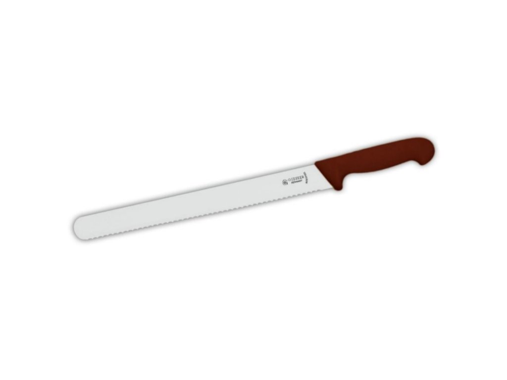 Nůž od německého výrobce Giesser nesmí chybět v žádné kuchyni. Jeho čepel se vyrábí z kvalitní nerezové oceli a tvarovaná rukojeť dovoluje jednoduché uchopení.Nůž uzenářský vlnité ostří 31 cm, hnědý