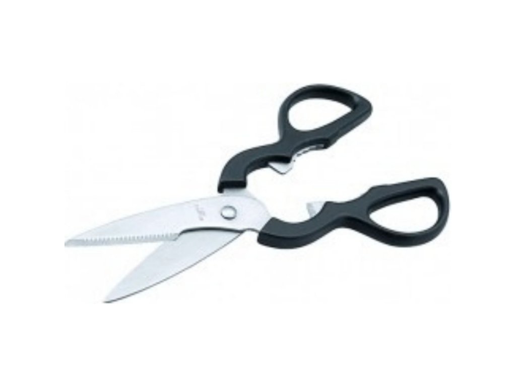 Kuchyňské nůžky vyrobené z nerezové oceli s černou rukojetí z ABS plastu patří mezi skvělé pomocníky do kuchyně. S ozubeným zařízením pro otevírání uzávěrů lahví a korunkových zátek vašim kuchařům pomůžou při přípravě různých pokrmů. Nůžky nelze demontovat.Nůžky, nerezová ocel