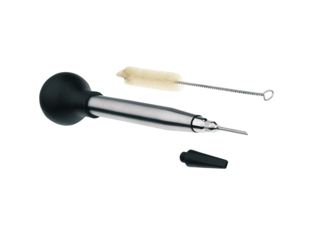 Tato plnící jehla představuje ono tajemství pro přípravu dokonale propečeného masa. Umožňuje podlévat maso během vaření, aby se nevysušilo, nebo vstříknout šťávu do jeho středu, aniž byste se přitom spálili. K tomu slouží 2 tipy: široká špička pro podlévání a špička jehly pro vstřikování šťávy. Vyrábí se z kvalitní nerezové oceli 18/10 a snadno se čistí pomocí kartáčku, který je součástí. Díky tomuto parťákovi budou vaše pečené masové pokrmy měkké a chutné.Plnička na maso