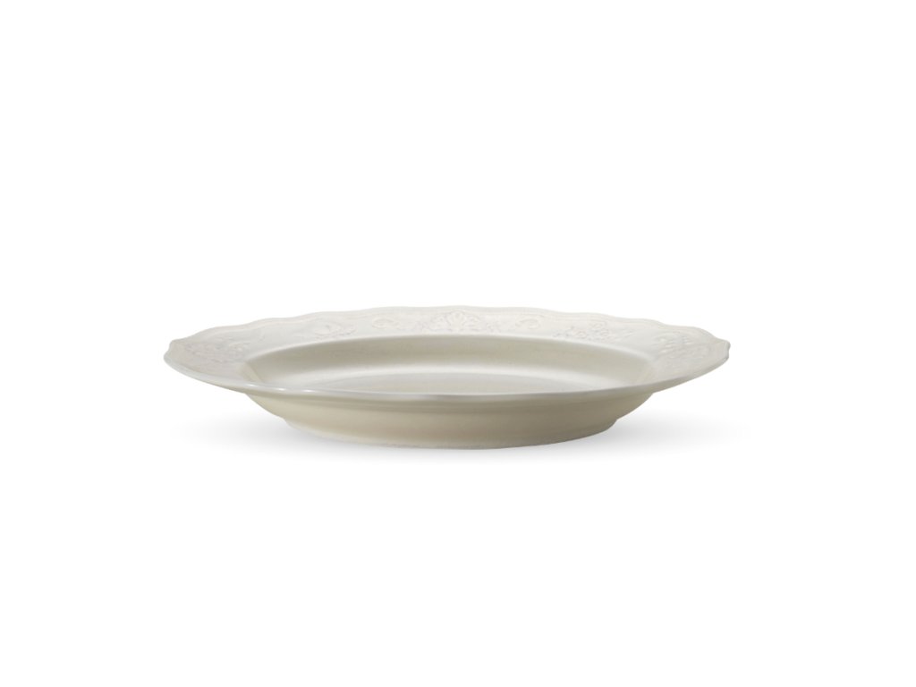 Oválný talíř z kolekce Poem Oat přináší na prostřený stůl nádech romantiky a klidu. Každý kus vyniká svou jedinečností, kterou podtrhuje charakter ručního zpracování, a precizní reliéfní zdobení mu dodává honosný nádech. Krémově perleťový odstín slonové kosti má měkký tón a přirozeně ladí s ostatními prvky stolování. Díky rozměrům 32 x 24 cm je talíř ideální volbou pro servírování hlavních chodů i sdílených pokrmů, jako je například finger food. Své místo najde v restauracích, kavárnách i hotelových provozech, zejména v interiérech s dřevěnými prvky, u snídaňových servisů nebo na svatební tabuli.