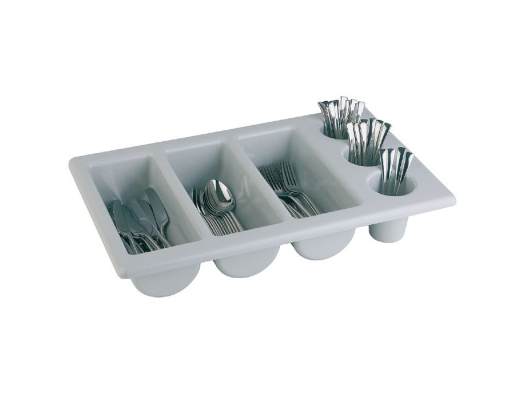 Plastový příborník je skvělým a nepostradatelným pomocníkem do kuchyně v každém gastronomickém podniku. Je snadno omyvatelný a má 6 přihrádek, z toho 3 na ležící příbory a 3 na stojící příbory.Příborník plastový