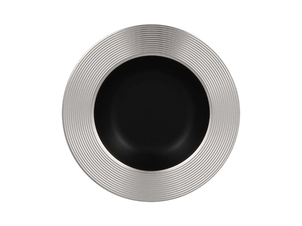 Porcelánový hluboký talíř s kruhovým reliéfem ve stříbrném dekoru a tajemně černým středem dodává vkusnou a elegantní atmosféru. Vaše hosty ohromí, zaujme a zpříjemní jim gastronomický zážitek. Prvotřídní porcelán zaručuje kromě svého atraktivního designu také svou odolnost a kvalitní zpracování.Hluboký talíř 23 cm, stříbrný