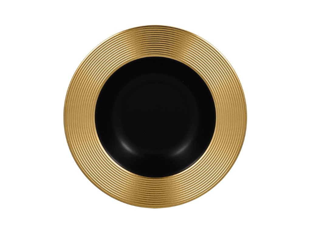 Porcelánový hluboký talíř s kruhovým reliéfem ve zlatém dekoru a tajemně černým středem dodává vkusnou a elegantní atmosféru. Vaše hosty ohromí, zaujme a zpříjemní jim gastronomický zážitek. Prvotřídní porcelán zaručuje kromě svého atraktivního designu také svou odolnost a kvalitní zpracování.Hluboký talíř 23 cm, zlatý