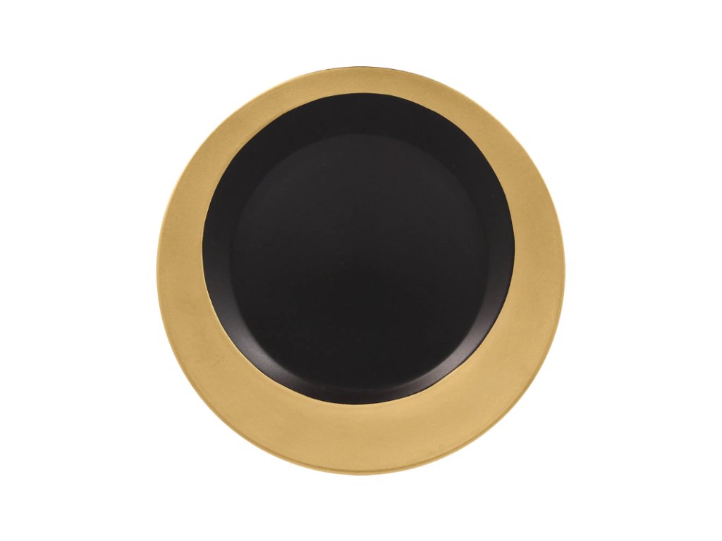 Porcelánový kulatý talíř s kruhovým reliéfem ve zlatém dekoru a tajemně černým středem dodává vkusnou a elegantní atmosféru. Vaše hosty ohromí, zaujme a zpříjemní jim gastronomický zážitek. Prvotřídní porcelán zaručuje kromě svého atraktivního designu také svou odolnost a kvalitní zpracování.Kulatý talíř