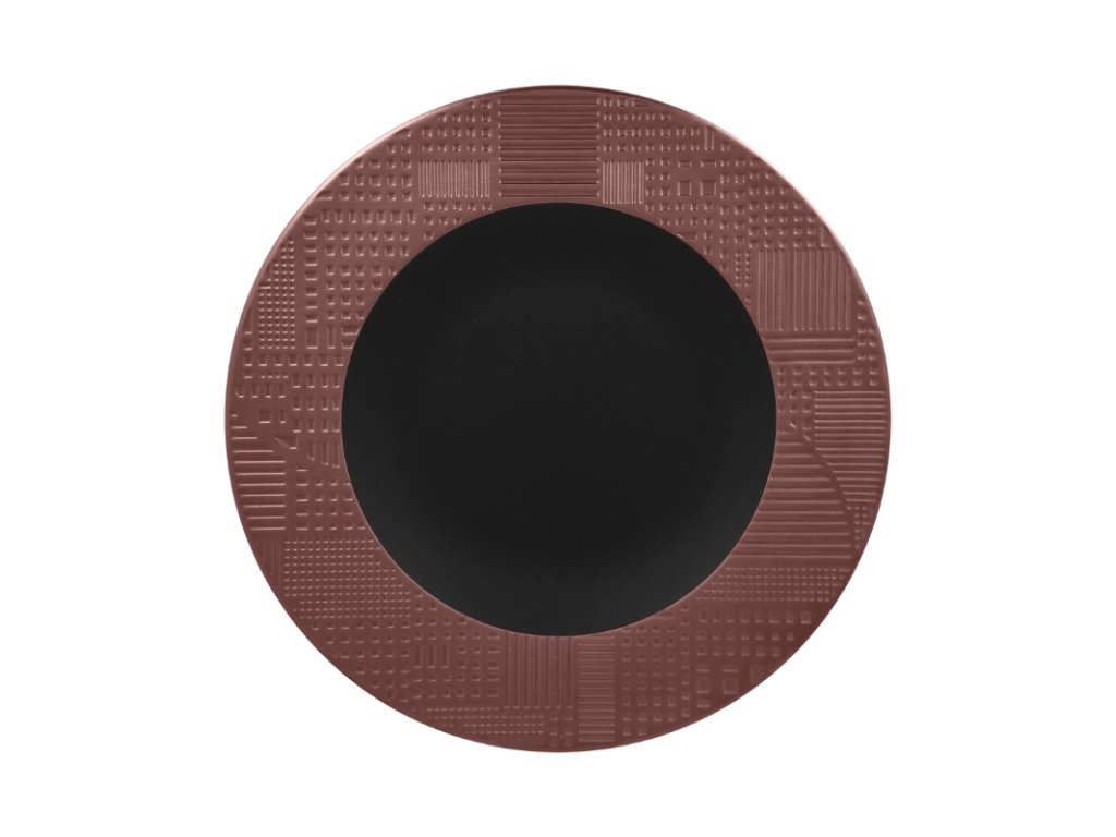 Porcelánový mělký talíř s reliéfem v bronzovém dekoru a tajemně černým středem dodává vkusnou a elegantní atmosféru. Vaše hosty ohromí, zaujme a zpříjemní jim gastronomický zážitek. Prvotřídní porcelán zaručuje kromě svého atraktivního designu také svou odolnost a kvalitní zpracování.Mělký talíř