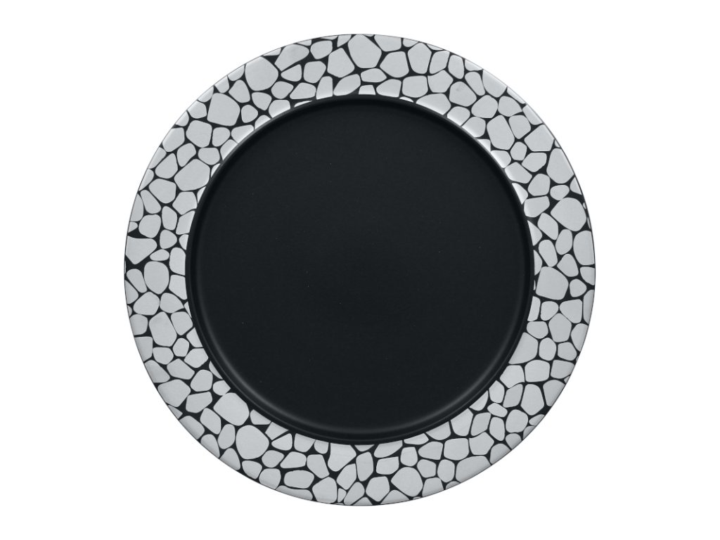 Mělký talíř s hranou vytvořený s prvotřídní kvalitou porcelánu nechá vyniknout ta nejlahodnější kulinářské speciality vašeho podniku. Díky své stříbrné dlažbě zářící na černém pozadí působí jako okouzlující měsíc svítící na temné noční obloze. Zkrátka dodává ten správný šmrnc a luxusní atmosféru na všechny jídelní stoly. Na černém středu bude pokrm zářit jako zmíněný měsíc.Talíř mělký s hranou pr. 32 cm, stříbrný