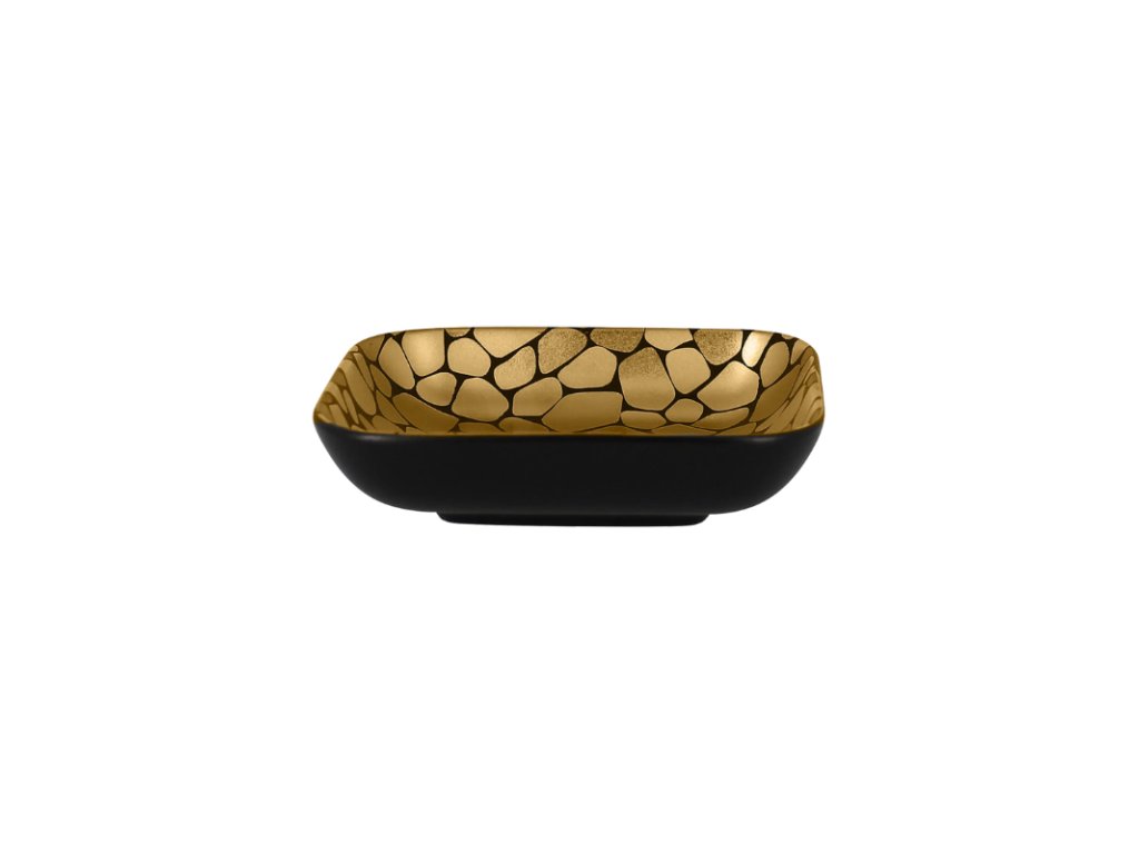 Miska s designovým dekorem vykreslujícím oblázky, které připomínají tisíce zářících sluncí. Kombinace zlatočerné dodává na luxusní atmosféře, která potěší a povznese gastronomické prožitky do slastných výšin nebes. Kvalitně zpracovaný porcelán zaručuje odolnost a dlouhodobou živostnost. Misku využijete pro podávání vašeho kulinářského umění všeho druhu.Miska čtvercová 15 × 15 cm