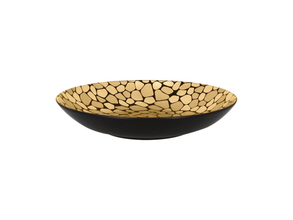 Hluboký talíř s designovým dekorem vykreslujícím oblázky, které připomínají tisíce zářících sluncí. Kombinace zlatočerné dodává na luxusní atmosféře, která potěší a povznese gastronomické prožitky do slastných výšin nebes. Kvalitně zpracovaný porcelán zaručuje odolnost a dlouhodobou živostnost. Talíř využijete pro podávání vašeho kulinářského umění všeho druhu.Talíř hluboký 120 cl