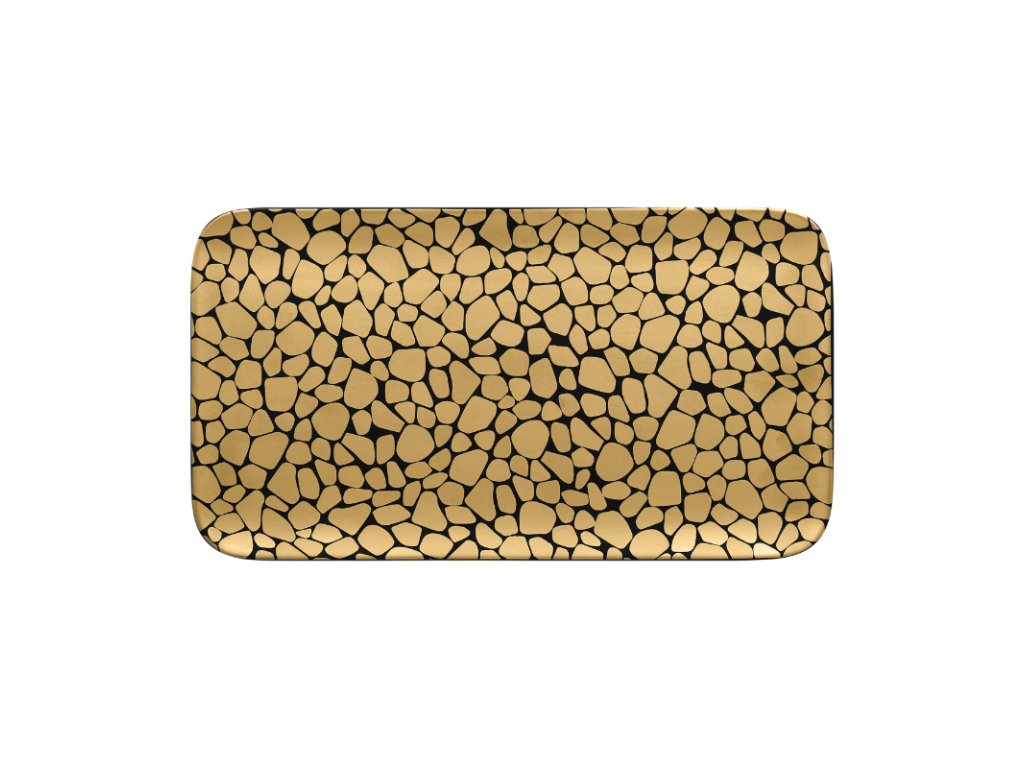 Talíř s designovým dekorem vykreslujícím oblázky, které připomínají tisíce zářících sluncí. Kombinace zlatočerné dodává na luxusní atmosféře, která potěší a povznese gastronomické prožitky do slastných výšin nebes. Kvalitně zpracovaný porcelán zaručuje odolnost a dlouhodobou živostnost. Talíř využijete pro podávání vašeho kulinářského umění všeho druhu.Talíř obdélný 38 × 21 cm