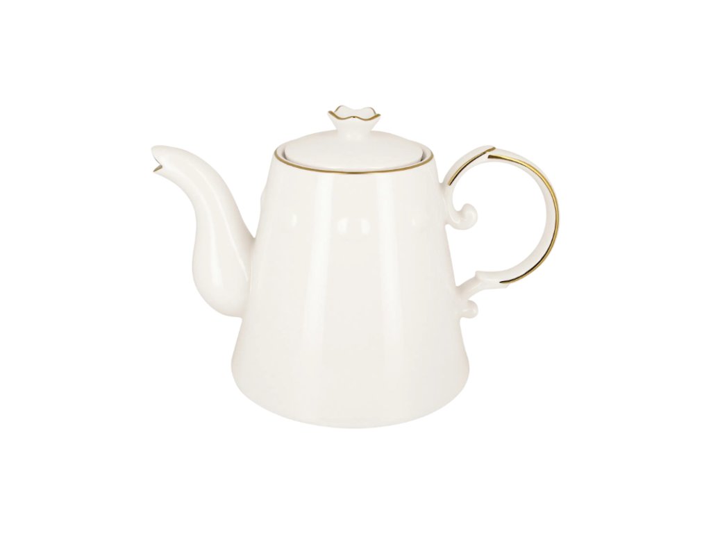 Tato konvička dodává pocit luxusu díky propracovanému designu a také uvolňující nádech jako při pohledu na vycházející slunce. Bílé provedení se zlatým okrajem poskytuje parádní plátno pro servírování těch nejlepších kulinářských výtvorů. Kvalitní porcelán přispívá na kvalitě v podobě dlouhodobé životnosti a odolnosti proti poškození.Konvička na čaj s víčkem 150 cl