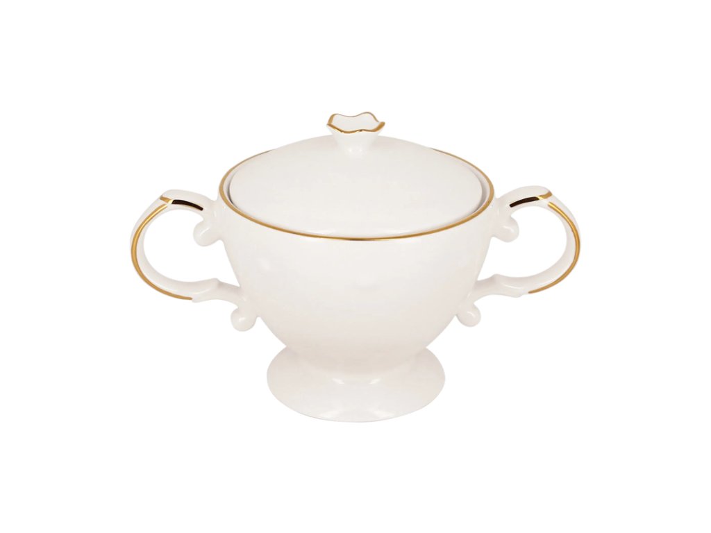 Tato mísa dodává pokrmům pocit luxusu díky propracovanému designu a také uvolňující nádech jako při pohledu na vycházející slunce. Bílé provedení se zlatým okrajem poskytuje parádní plátno pro servírování těch nejlepších kulinářských výtvorů. Kvalitní porcelán přispívá na kvalitě v podobě dlouhodobé životnosti a odolnosti proti poškození.Mísa na polévku a poklička pr. 21,5 cm