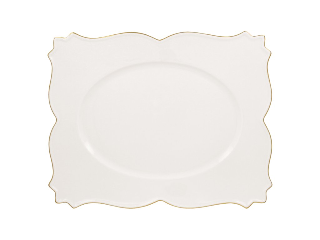 Tento podnos dodává pokrmům pocit luxusu díky propracovanému designu a také uvolňující nádech jako při pohledu na vycházející slunce. Propracované tvarování v bílém provedení se zlatým krajkovaným okrajem poskytuje parádní plátno pro servírování těch nejlepších kulinářských výtvorů. Kvalitní porcelán přispívá na kvalitě v podobě dlouhodobé životnosti a odolnosti proti poškození.Podnos 42 × 32,5 cm