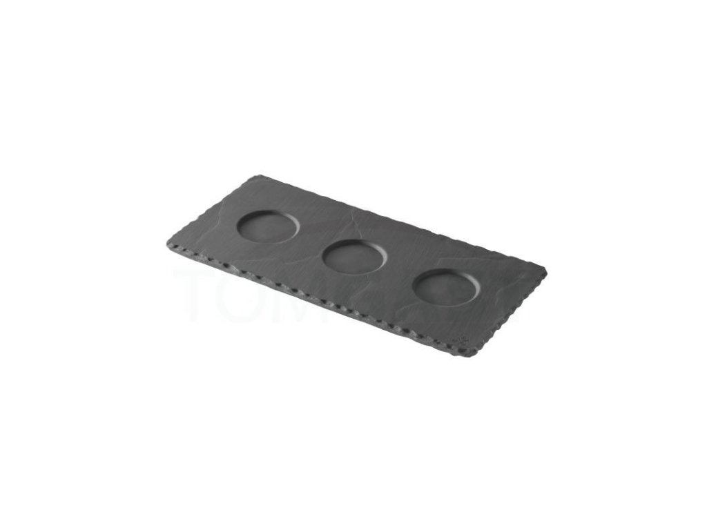 Basalt tác se třemi prolisy se svým originálním designem je skvělou volbou na podávání kávy, čaje, čokoládové pěny, omáček nebo dochucovadel. Do prolisů se perfektně hodí Froissés hrnky (8 cl) a misky Impulse z kolekce Miniatures (4 cl).Tác se třemi prolisy (Ø 4 cm) 25 × 12 cm