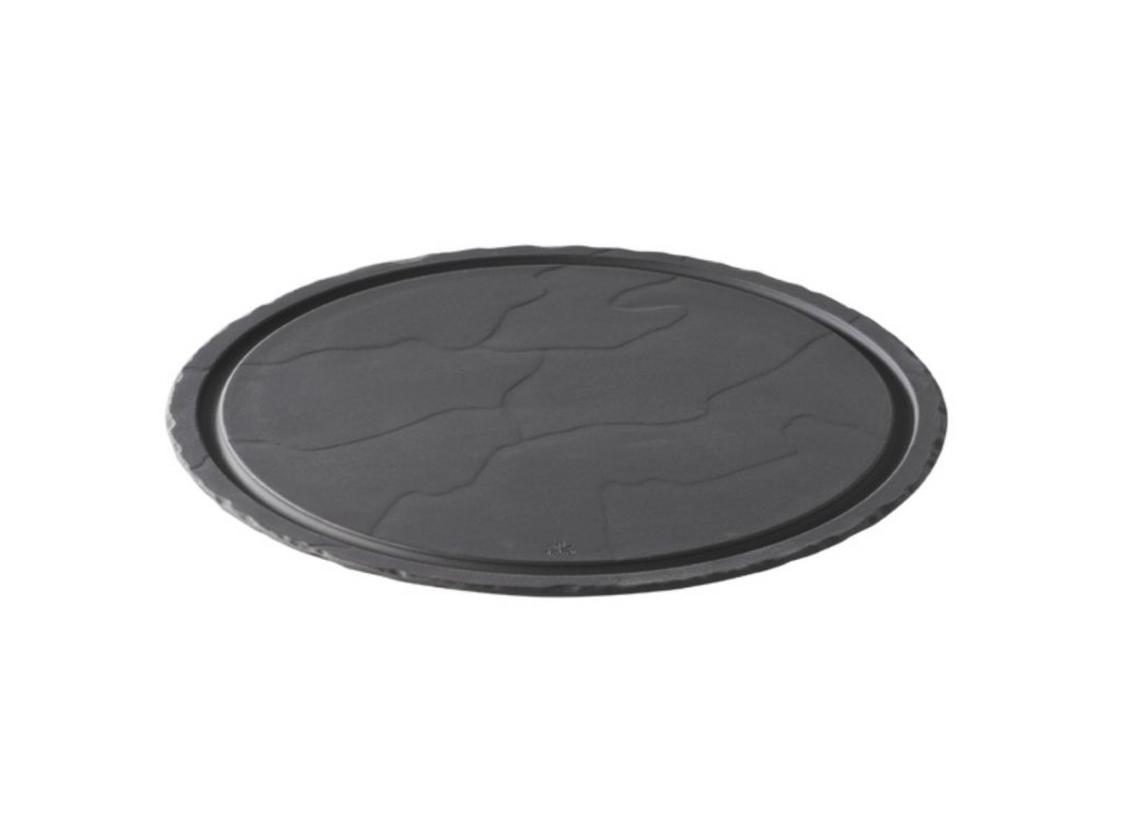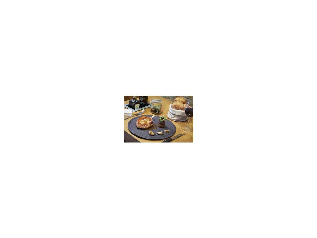 Basalt talíř kulatý s drážkou spojuje půvab břidlice s výhodami porcelánu. Jeho přírodní vzhled zdokonalí každé jídlo (maso, burgery, ryby apod.) a velikost talíře vám dovolí současně servírovat i přílohy jako špízy, vařenou zeleninu, hranolky a spoustu dalších. Drážka okolo středu vytváří rustikální dojem a umožňuje servírovat i omáčky. Talíř se dá kombinovat i s bambusovou deskou (REV-649164), která doplňuje celou prezentaci.Talíř kulatý s drážkou 30 cm