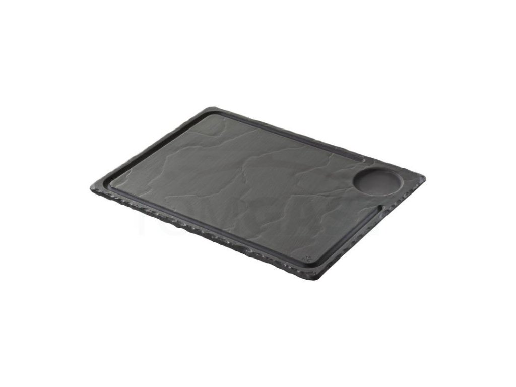 Basalt talíř na steak spojuje půvab břidlice s výhodami porcelánu. Jeho přírodní vzhled zdokonalí každé jídlo (maso, burgery, ryby, sýry apod.) a velikost talíře vám dovolí současně podávat i přílohy jako špízy, vařenou zeleninu, hranolky a spoustu dalších. Do prolisu se vejde mistička s omáčkou, nebo dochucovadlem. Pro větší eleganci doporučujeme talíř doplnit dřevěnou deskou REV-649188.Talíř na steak 33 × 24 cm