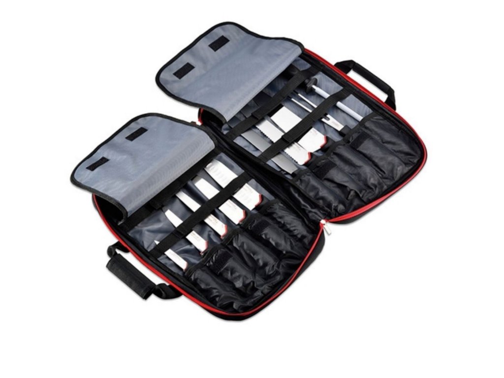 Sestava 10 kusů různých nožů Prime Line v praktické tašce. Obsahuje rovnou roztírací paletu 26 cm (GM-8215), vidlici 18 cm (GM-9437), oválnou ocílku 31 cm (GM-992-31), řeznický nůž 15 cm (GM-12316), filetovací nůž 18 cm (GM-217365), nůž na pečivo 25 cm (GM-218265w), uzenářský nůž 18 cm (GM-218269wwl), nůž na zeleninu 10 cm (GM-218315), kuchařský nůž 26 cm (GM-218455), kuchařský nůž 18 cm (GM-218456). Nože se vyrábí s ergonomickou měkčenou rukojetí s protiskluzovými drážkami zajišťujícími, že se nůž skvěle drží při každé situaci. Protiskluzová rukojeť zajišťuje bezpečnost, i když máte mokré ruce a je antibakteriálně ošetřena.Sestava nožů