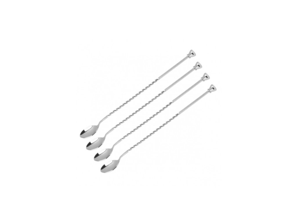 Set 4 koktejlových lžic se spirálovou rukojetí určených pro přípravu míchaných drinků a koktejlů. Mají velmi dlouhou rukojeť, která se používá k míchání a dávkování přísad. Umožňuje míchat velmi jednoduchým a hygienickým způsobem. Zakroucený tvar poskytuje možnost vytvářet koktejly ve vrstvách. Lze je umývat v myčce nádobí.Set lžiček barových, 4 ks