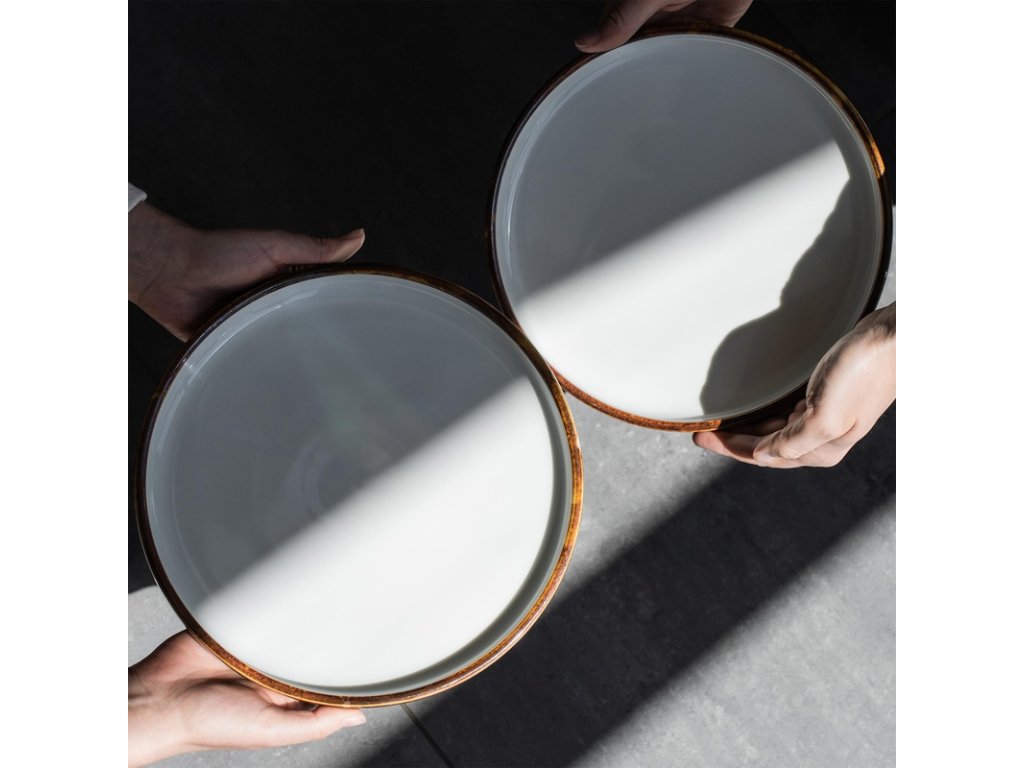 Podpořte smyslnost a vychutnejte si své jídlo s nezapomenutelnou chutí. Tento talíř ukazuje kouzlo jemné elegance a jedinečnosti, čímž přitahuje pozornost všech strávníků. Svým ručním zpracováním a originálním designem nechává vyniknout vaše kulinářská díla. Silný tvar nádobí a masivní tloušťka porcelánu dodávají této kolekci rustikální charakter. Dodatečného efektu odbarvení a nerovnoměrného rozložení barev na vnějším povrchu nádobí bylo dosaženo díky speciální metodě použití reaktivního smaltu. Kvalitní porcelán se postará o dlouhodobou radost z používání a umožňuje mytí v myčce nádobí.Talíř mělký pr. 25 cm