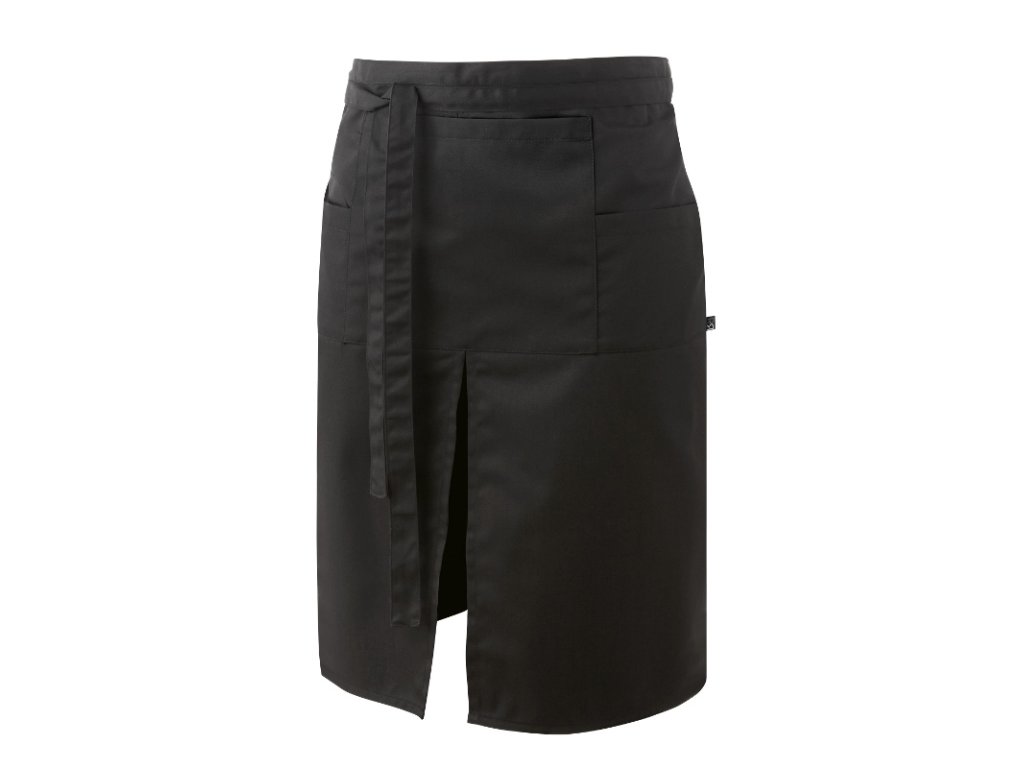 Tato zástěra představuje dokonalý kousek do každého gastronomického podniku, neboť vypadá stylově. Navíc díky šikovným kapsám (3 – 1 větší uprostřed, 2 menší na bocích) je praktickým kouskem pro každodenní práci v profesionální gastronomii. Zavazuje se v pase a má přední rozparek pro lepší volnost pohybu. Lze ji prát v pračkách.Zástěra, černá