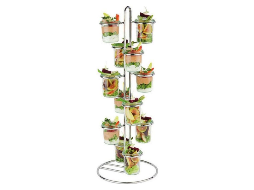 Stojan je ideální pro podávání bufetů, rautů nebo švédských stolů ve vašem podniku. Je určený pro pohárky Fingergood, které se do něj umístí a můžete takto vkusně a zajímavě podávat různé pokrmy. Můžete na něj umístit až 12 takových pohárků o průměru 60 mm. V balení se nachází pouze stojan bez pohárků a sklenice je třeba zakoupit samostatně. Stojan z pochromované oceli dokonale zapadne do místnosti, ve které bude umístěn. Může být použit profesionály i amatérskými kuchaři.Stojan bufetový