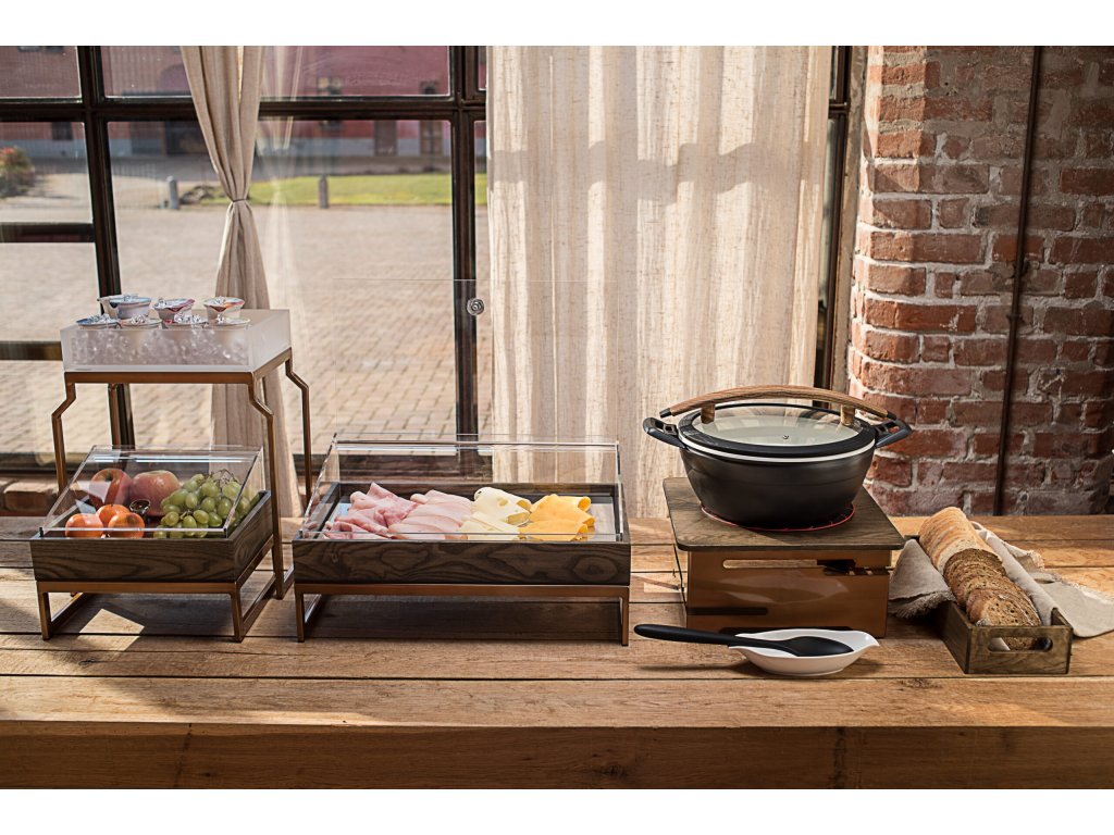 Čtvercový stojan pro indukční varnou desku přináší estetický prvek do gastronomických provozů, jako jsou hotelové bufety, cateringové služby nebo restaurační výdejní stanice. Díky konstrukci z nerezové oceli 18/10 a decentní bronzové povrchové úpravě s práškovým nástřikem je nejen odolný, ale i vizuálně atraktivní pro vaše hosty. Tento stojan je kompatibilní s indukční deskou Y-11764-230 (není součástí balení). Silikonové protiskluzové prvky zajišťují stabilitu a bezpečnost při používání.Technické parametry