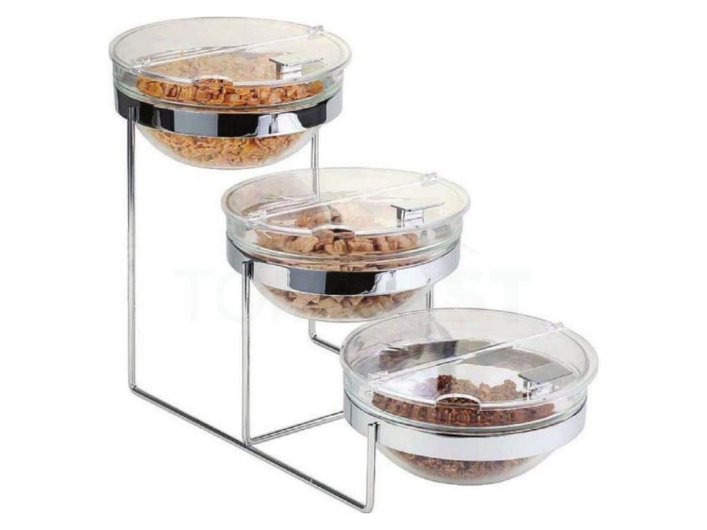 Stojan se skvěle hodí bufety, rauty či švédské stoly, zejména pro podávání snídaní. Vyrábí se v chromovaném provedení a jeho součástí jsou také 3 skleněné misky o průměru 23 cm a plastová víčka s výřezem na lžíci. Ideální hlavně pro různé snídaňové cereálie.Stojan