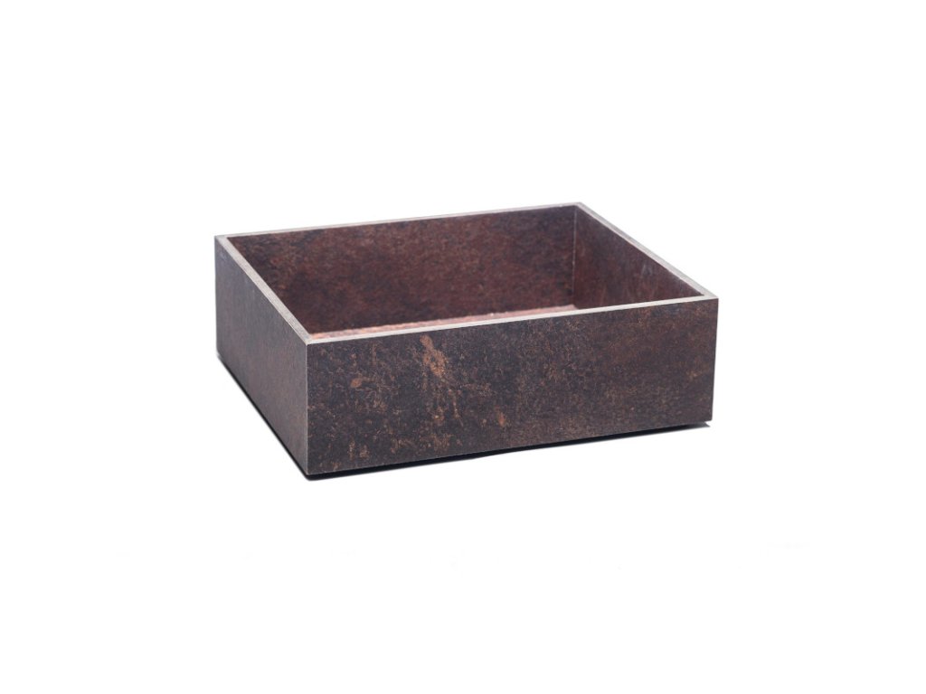 T-Collection box HPL s dekorem rzi umožňuje prezentaci potravin ve vašich gastronomických provozech. Materiál HPL je odolný vůči vlhkosti a mechanickému poškození, neabsorbuje tekutiny ani pachy. Dekor rzi tak vytvoří naturální vzhled pro vaše bufetové snídaně a samoobslužný výdej pokrmů. Box lze kombinovat s dalšími boxy, bufetovými stojany a je také stohovatelný. Doplňte svůj bufetový systém o tento funkční box s rozměry 325 x 265 x 100 mm, ve kterém lze servírovat čerstvé pečivo, ovoce, dezerty nebo studené pokrmy.Technické parametry