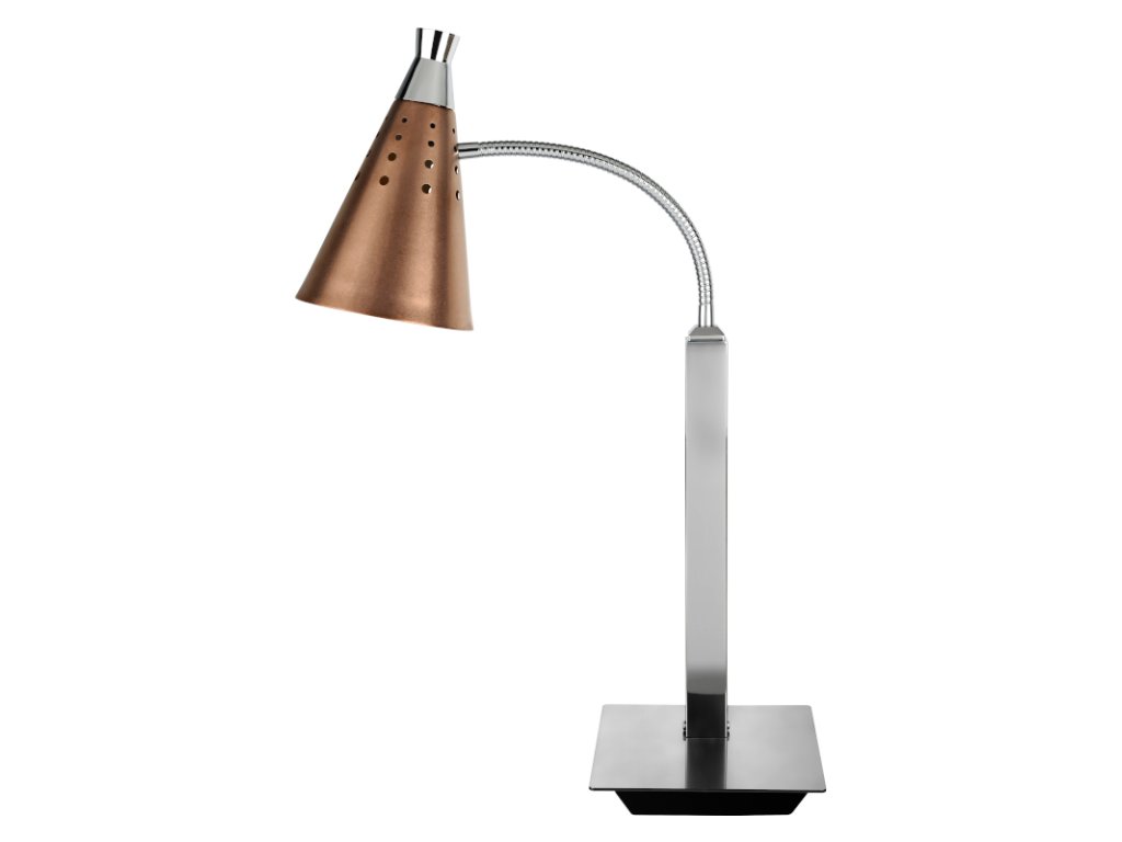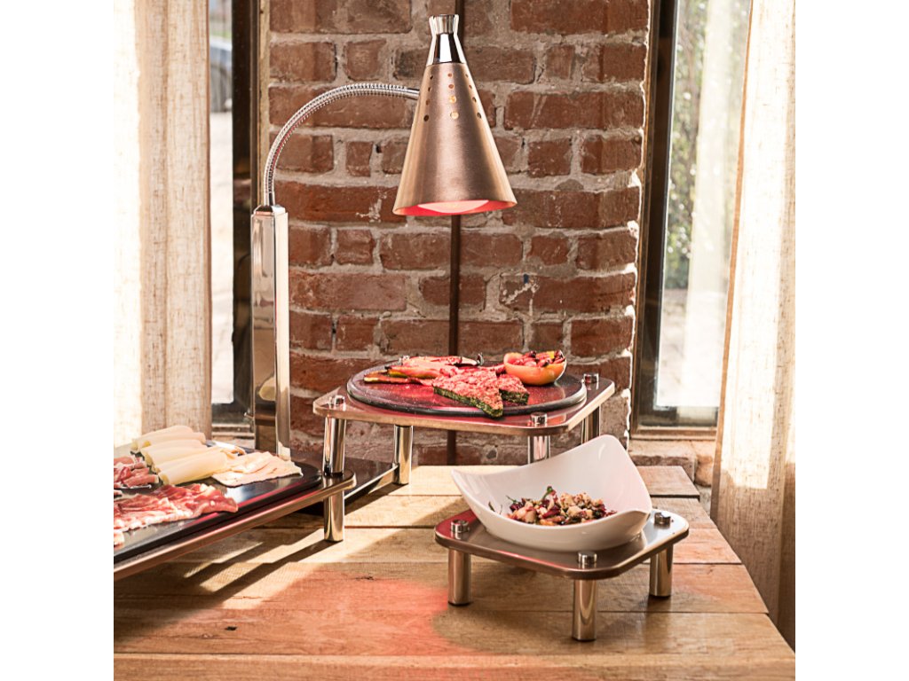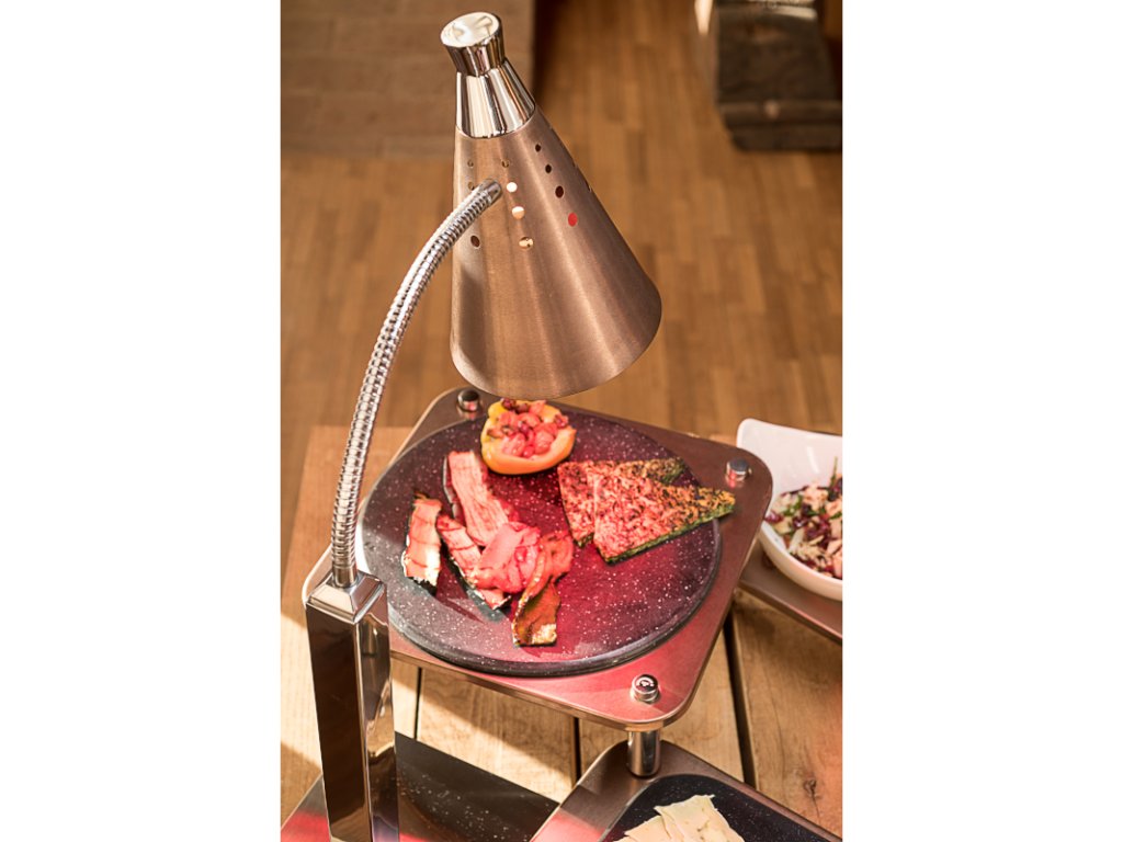 T-Collection ohřívací lampa s PVD bronzovým povlakem je vhodná pro váš bufetový systém k udržení teploty pokrmů. Flexibilní konstrukce vám umožní snadno nastavit výšku a směr světla podle potřeb. Tato lampa disponuje napětím 230 V s maximálním výkonem 250 W. Infračervená žárovka není součástí balení. Doplňkový sortiment: Lze v naší nabídce dokoupit infračervenou žárovku s maximálním výkonem 150 W (kód: Y-BR125150).Technické parametry
