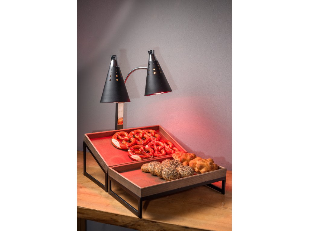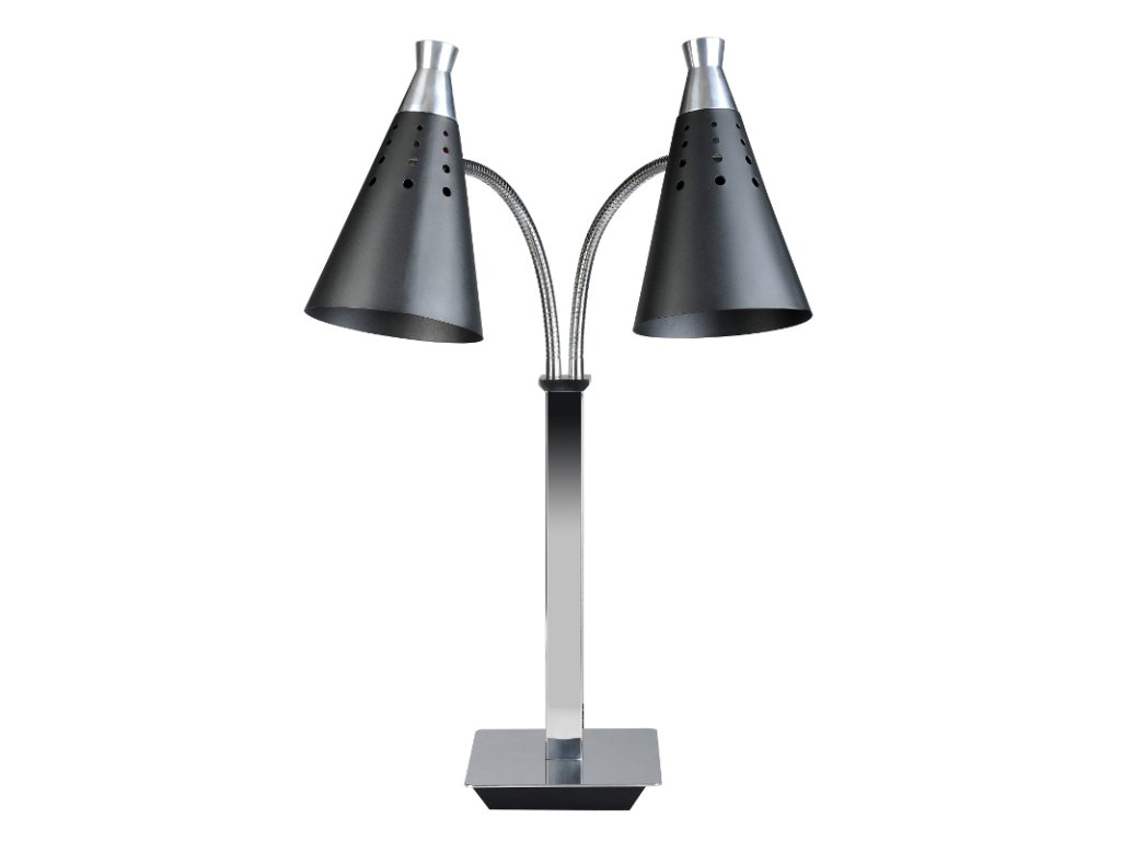 T-Collection dvojitá ohřívací lampa s černým práškovým nástřikem je vhodná pro váš bufetový systém k udržení teploty pokrmů. Flexibilní konstrukce vám umožní snadno nastavit výšku a směr světla podle potřeb. Tato lampa disponuje napětím 230 V s maximálním výkonem 250 W. Infračervené žárovky nejsou součástí balení. Doplňkový sortiment: Lze v naší nabídce dokoupit infračervené žárovky s maximálním výkonem 150 W (kód: Y-BR125150).Technické parametry