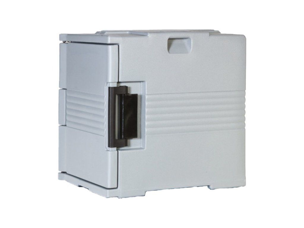 Box je vyrobený rotačním tvářením z nízko hustotního polyetylenu (LLDPE) potravinářské kvality – odolává teplotám od -40 do +100 °C, neabsorbuje pachy ani barvy a je bezpečný pro kontakt s jídlem. Mezi dvojitými stěnami se nachází silná vrstva CFC-free polyuretanové izolace o hustotě 38–40 kg/m³, která zajistí maximální udržení teploty – ztráta jen 1,5 °C za hodinu u teplých pokrmů, u studených naopak udržuje stejnou teplotu. Odolné panty a uzávěry z nylonu PA6 snesou i nešetrné zacházení při častém nakládání. Termoport se plní zpředu, GN nádoby zasunete snadno a bezpečně, bez rizika popálení rukou nebo komplikovaného skládání pokrmů.