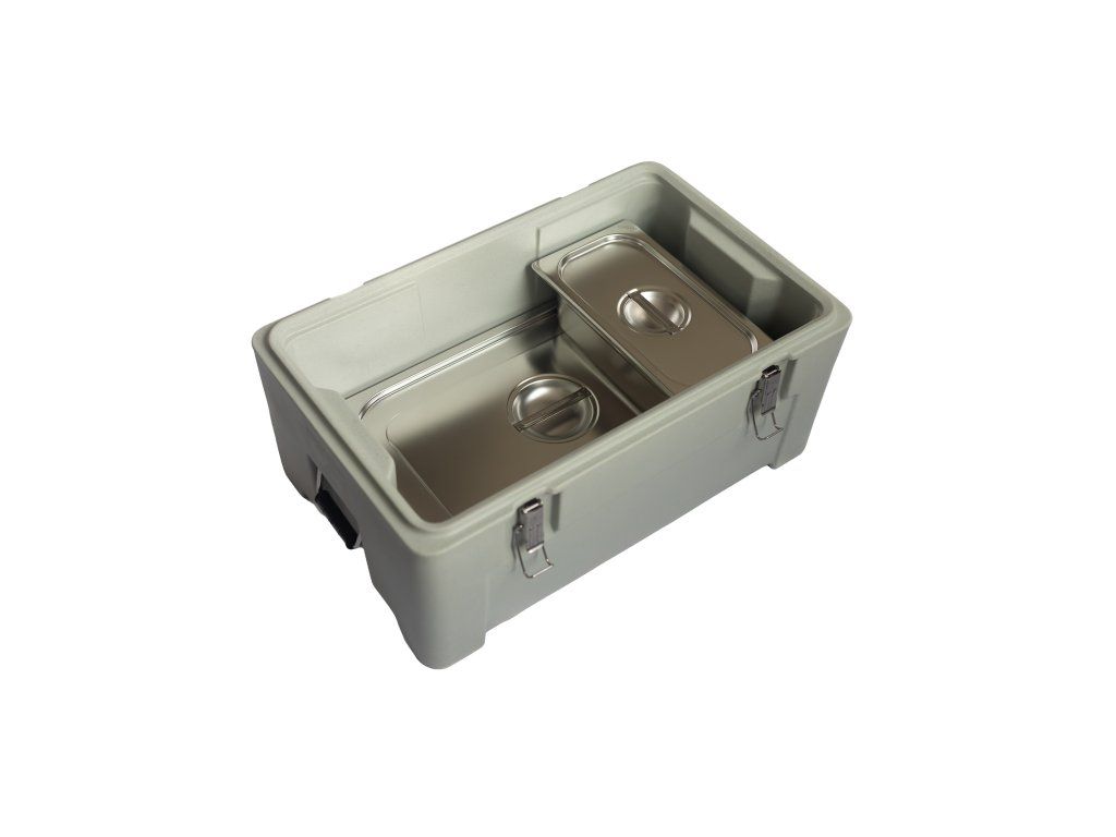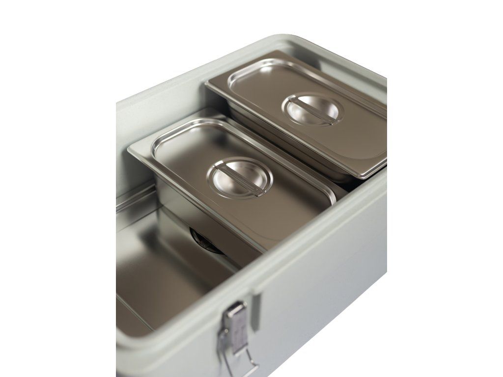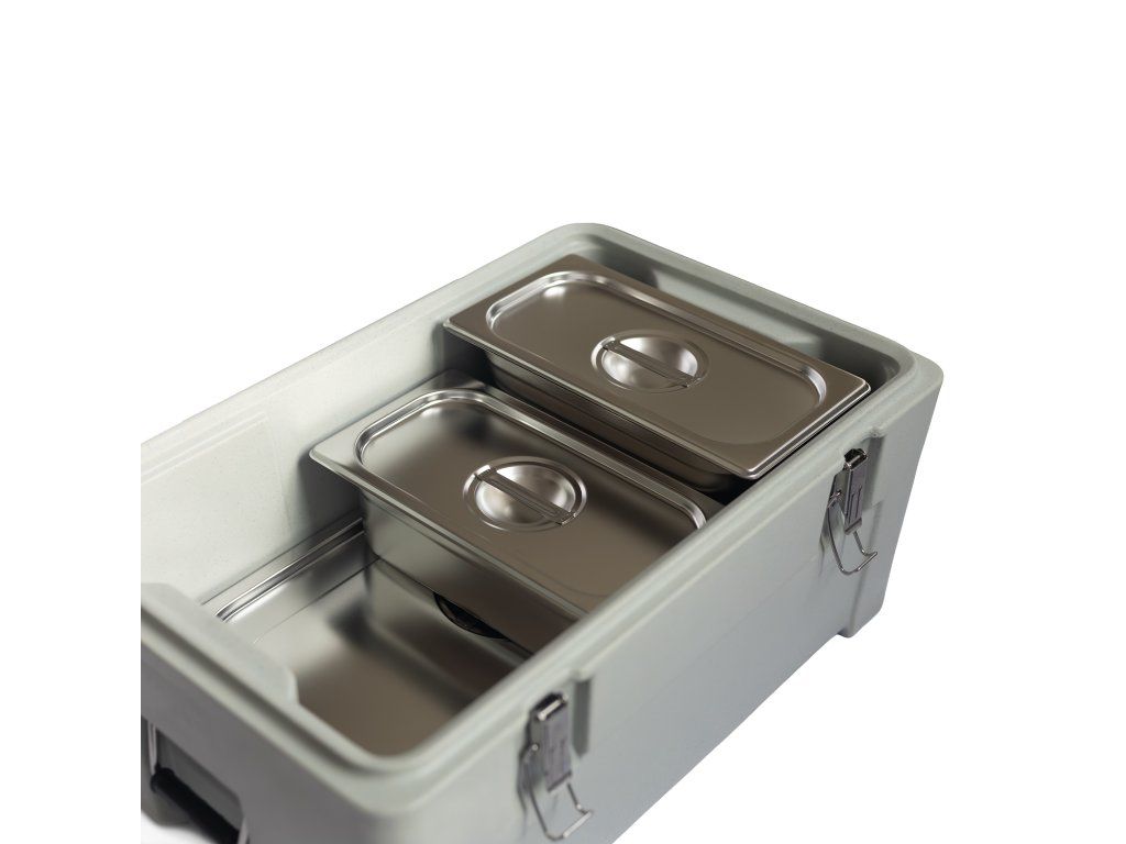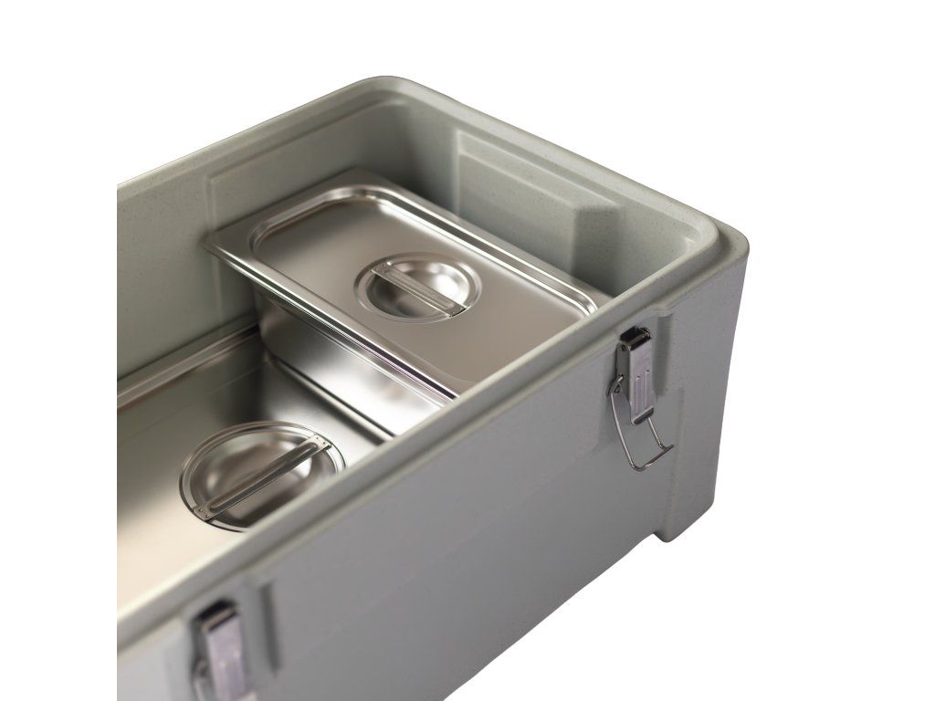 Termoport je určen pro stohovatelné GN nádoby 1/1 o hloubce 200 mm, včetně jejich poddělení (GN 1/2, 1/3, 1/4, 1/6). Vnitřní vodící a fixační systém zajišťuje stabilní polohu GN nádob, minimalizuje jejich pohyb během přepravy a umožňuje přehledné uspořádání menu.