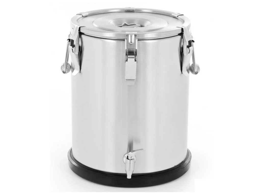 Prefesionální termos Duplitherm o objemu 25 l špičkové kvality s dvojitým pláštěm izolovaným speciální pěnou slouží pro udržení horkých i studených pokrmů a nápojů v ideální teplotě až po dobu 8 hodin. Jedná se o skvělého pomocníka při přepravě horkých jídel a tekutin. Víko s odolným silikonovým těsněním se postará o udržení správné teploty a zabraňuje vytékání tekutin a uchycuje ho 6 masivních přezek. Ergonomické rukojeti s vícebodovým svařováním slouží pro pohodlnou a bezpečnou manipulaci a úchyt víka pro zvedání víka (nepoužívejte ke zvedání várnice). Várnice vybavena výpustným kohoutem. Pro termos lze objednat nerezový podstavec.Termos s výpustným kohoutem 25 l