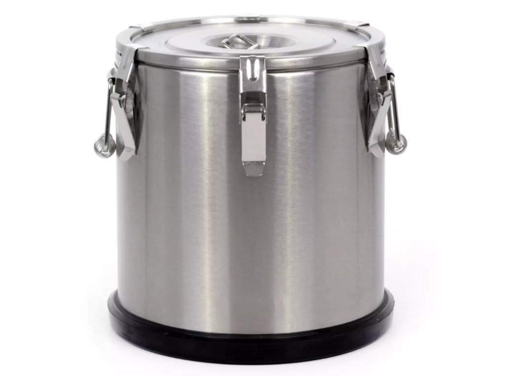 Kvalitní celonerezoý termos s dvojitým pláštěm izolovaným speciální pěnou slouží pro udržení horkých i studených pokrmů a nápojů v ideální teplotě až po dobu 8 hodin. Jedná se o skvělého pomocníka při přepravě horkých jídel a tekutin. Víko s odolným silikonovým těsněním se postará o udržení správné teploty a zabraňuje vytékání tekutin. Skvěle se tak hodí do různých jídelen, hotelů a jiných podniků. Plastový podstavec stabilizuje termos a brání jeho volnému pohybu po povrchu a chrání před náhodným poškozením výrobku i povrchu. Termos má šest háků držících víko a má i vyrovnávací ventilek tlaku.Termos bez výpustného kohoutu 20 l