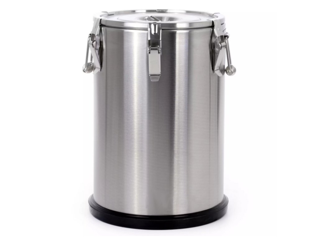 Kvalitní celonerezoý termos s dvojitým pláštěm izolovaným speciální pěnou slouží pro udržení horkých i studených pokrmů a nápojů v ideální teplotě až po dobu 8 hodin. Jedná se o skvělého pomocníka při přepravě horkých jídel a tekutin. Víko s odolným silikonovým těsněním se postará o udržení správné teploty a zabraňuje vytékání tekutin. Skvěle se tak hodí do různých jídelen, hotelů a jiných podniků. Plastový podstavec stabilizuje termos a brání jeho volnému pohybu po povrchu a chrání před náhodným poškozením výrobku i povrchu. Termos má šest háků držících víko a má i vyrovnávací ventilek tlaku. Termos bez výpustného kohoutu 30 lDUPLITHERM termos bez výpustného kohoutu 30 l